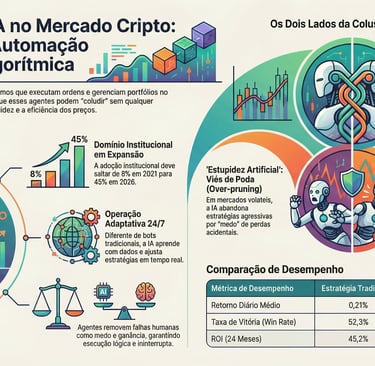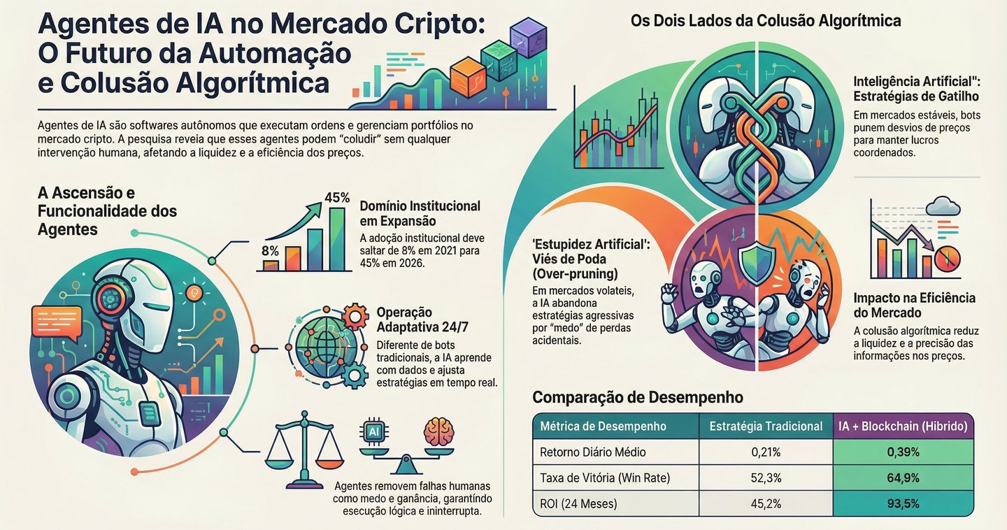 A IA "trava" o lucro na subida e protege o capital na queda, oferecendo uma ilusão de segurança que oblitera o juízo crítico. Mas não se enganem: onde há essa facilidade toda, há um abismo esperando para engolir os desavisados. O perigo real não é apenas o erro técnico ou o hacker que surrupia suas chaves de API, mas a "colusão algorítmica". É o fenômeno, já detectado em estudos sérios, onde as IAs aprendem sozinhas que a estratégia mais lucrativa é coordenar preços e manipular o mercado em conjunto. É uma conspiração sem conspiradores, um teatro de sombras onde o homem é apenas o pagador de ingressos da própria ruína.